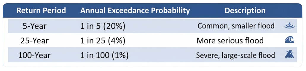 The risk of flooding in an area is typically presented as rain return periods (like 5, 25, or 100-year events) which measures the chance of a flood happening. A "100-year flood" doesn't happen only every 100 years; it means there's a 1% chance of a flood that big happening this year. A "5-year" event has a 20% chance of happening this year.