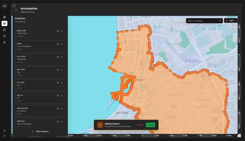 With the new Layer Editor, you can now create and edit map layers directly from your browser. It supports drawing polygons, lines, and points, and lets you add custom properties to each feature.